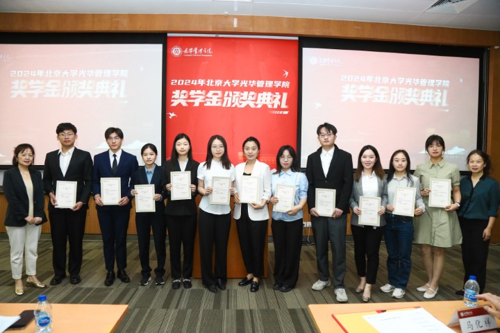 5月11日,北京大學(xué)光華管理學(xué)院2024年度獎(jiǎng)學(xué)金頒獎(jiǎng)典禮在學(xué)院1號(hào)樓203報(bào)告廳舉行,為82名品學(xué)兼優(yōu)的光華學(xué)子頒發(fā)“羚銳獎(jiǎng)學(xué)金”等10個(gè)獎(jiǎng)學(xué)金項(xiàng)目。光華管理學(xué)院院長(zhǎng)劉俏,學(xué)院黨委書(shū)記馬化祥,學(xué)院副院長(zhǎng)張圣平、沈俏蔚,學(xué)院黨委副書(shū)記鞠曉等教職工代表,羚銳制藥副總經(jīng)理陳燕,其他獎(jiǎng)學(xué)金捐贈(zèng)方代表和獲獎(jiǎng)學(xué)生共同參加了頒獎(jiǎng)儀式。