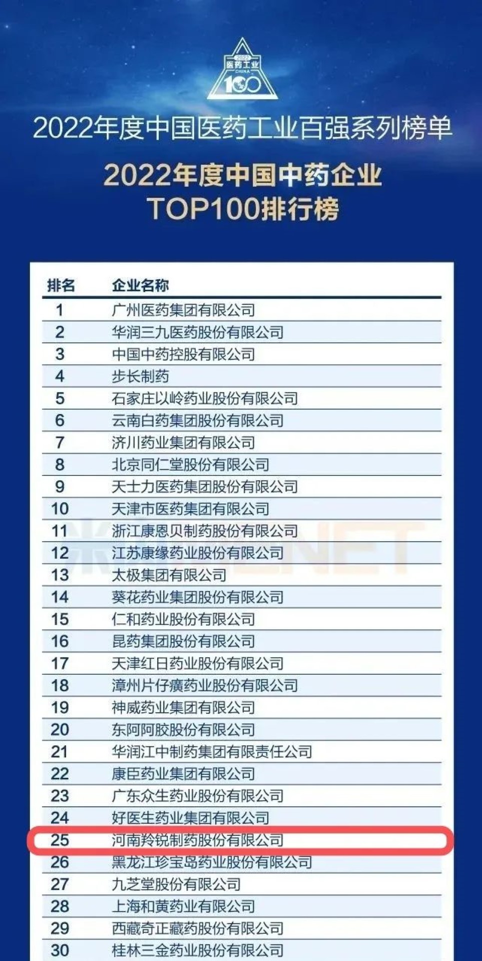 羚銳制藥入選中藥企業TOP100排行榜第25位